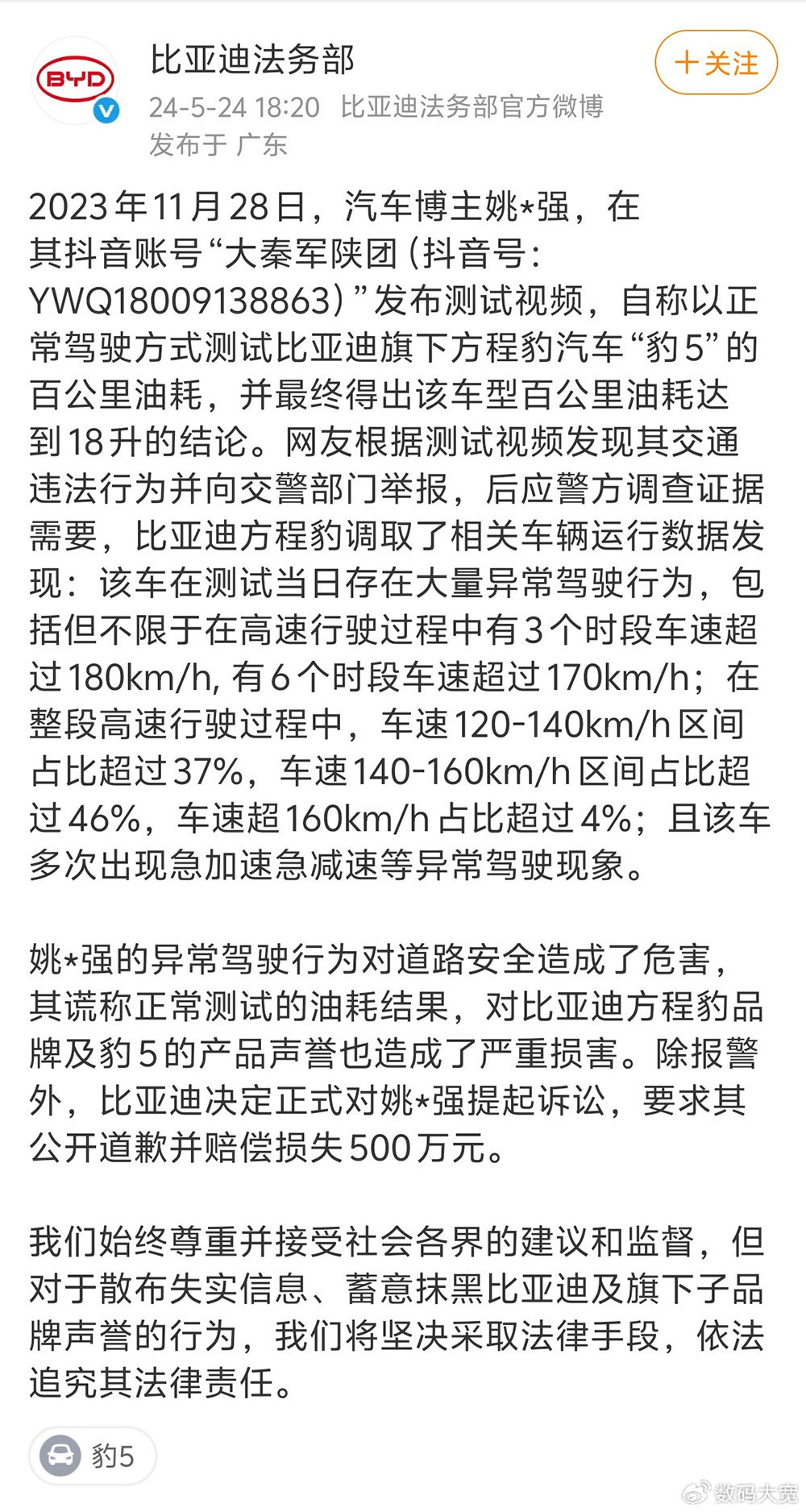 2023 年 12 月,方程豹豹 5 上市之际,姚*强通过抖音账号“大秦军陕团”发布视频,声称以正常驾驶方式测试方程豹旗下车型豹5(配置|询价),得出百公里油耗18L的结论,在网络上引起了大范围的关注及讨论。之后应警方调查取证需要,比亚迪调取数据显示:测试当日车辆存在大量异常驾驶行为,高速行驶过程中有3个时段车速超过180km/h, 有6个时段车速超过170km/h,在整段高速行驶过程中,车速120-140km/h区间占比超过37%,车速140-160km/h区间占比超过46%,车速超160km/h占比超过4%。