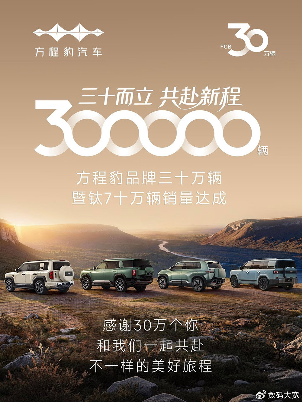1月15日,方程豹汽车宣布品牌累计销量突破30万辆,成为最快达成30万辆的新势力品牌TOP2、更是20-30万辆新势力品牌增速TOP1。