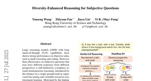 Q1:MultiRole-R1是什么?它能解决什么问题? A:MultiRole-R1是香港科技大学开发的AI推理框架,专门解决大型AI模型在处理主观性问题时思维过于单一的问题。它让AI学会从多个不同角色的视角思考同一个问题,就像让AI参加多人头脑风暴会议一样,从而获得更全面、更准确的答案。