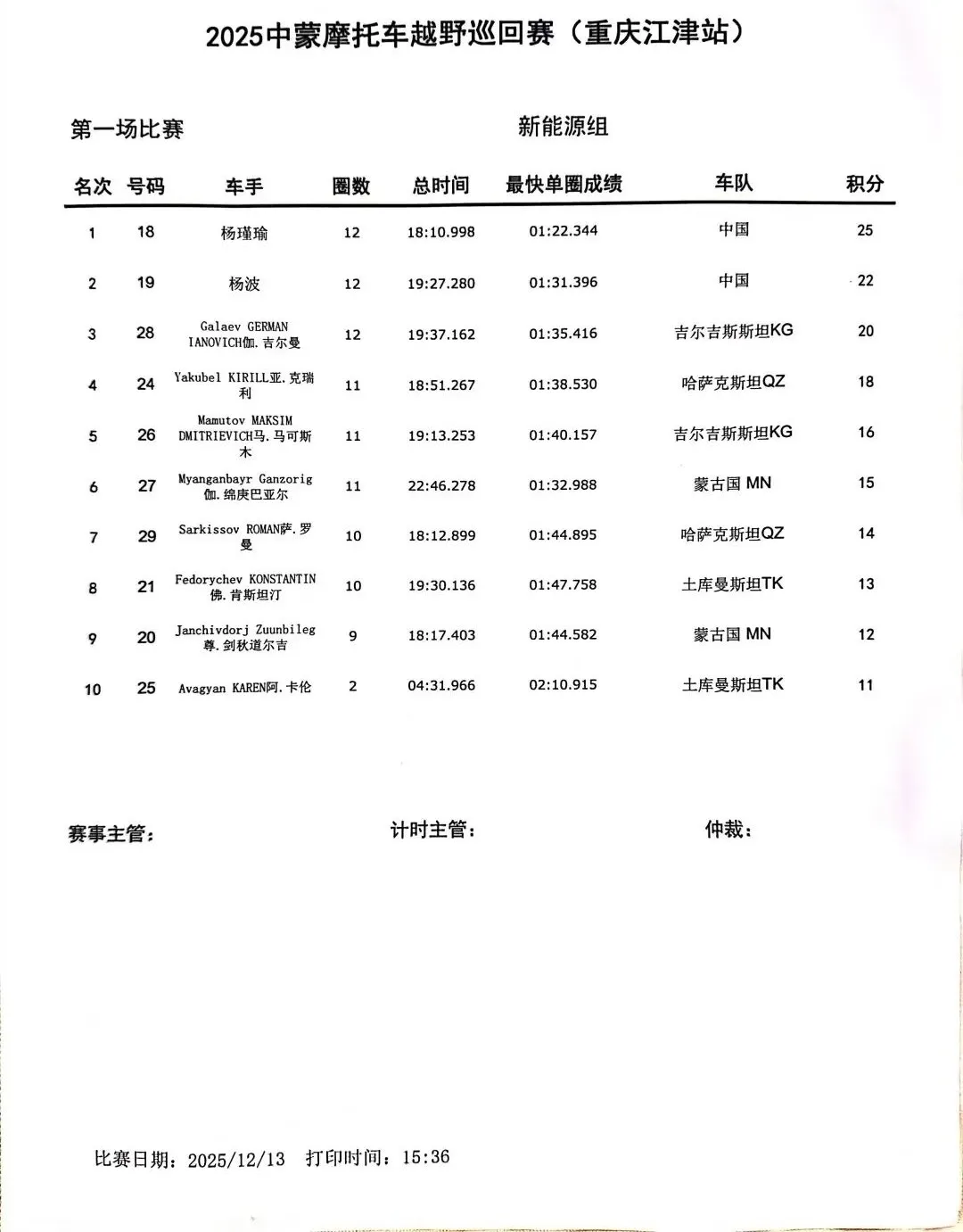 此次比赛,参加新能源组别比赛的10名国内外车手均顺利完赛,而中国车手杨瑾瑜与杨波分列冠亚军,来自吉尔吉斯斯坦的Galaev GERMAN IANOVICH伽.吉尔曼荣获季军。