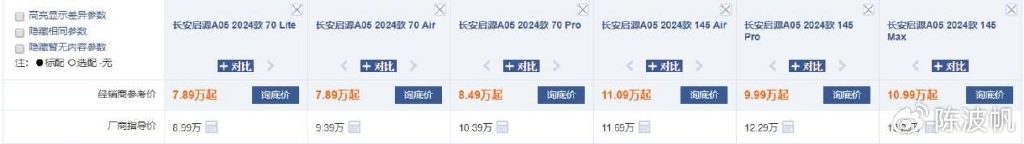 而重点就在于,此次长安启源A05各配置车型的优惠力度并不一致,且没有规律可循。比如指导价8.99万元的70 Lite版,优惠后售价是7.89万元,优惠金额为1.1万元;指导价10.39万元的70 Pro版车型,优惠后售价是8.49万元,优惠金额为1.9万元;指导价11.69万元的145 Air版,优惠后售价是11.09万元,优惠金额是0.6万元;指导价12.29万元的145 Pro版,优惠后售价是9.99万元,优惠金额为2.3万元;指导价13.29万元的145 Max版,优惠后售价是10.99万元,优惠金额为2.3万元。