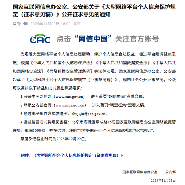 为规范大型网络平台个人信息处理活动,保护个人信息合法权益,促进平台经济健康发展,根据《中华人民共和国个人信息保护法》《中华人民共和国数据安全法》《中华人民共和国网络安全法》《网络数据安全管理条例》等法律法规,国家互联网信息办公室、公安部起草了《大型网络平台个人信息保护规定(征求意见稿)》,现向社会公开征求意见。公众可以通过以下途径和方式提出反馈意见: