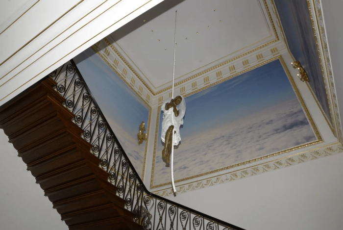 此次最新公布的照片显示,爱泼斯坦位于纽约上东区的7层别墅入口处悬挂了一个雕塑,雕塑是一位新娘紧紧抓住一根绳子。