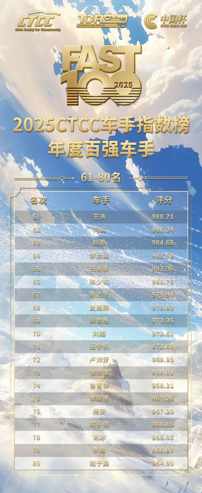 展望未来,CTCC中国汽车场地职业联赛将致力于打造更科学、更开放、更具成长性的中国赛车新生态。CTCC车手指数榜·年度百强车手不仅是一个最终的成绩榜单,更是一套深度挖掘车手与车队价值的动态评估体系——通过引入更丰富的数据维度、优化算法模型,并深度融合人工智能与大数据技术,使评价标准更为科学、公正、全面,真实反映参赛者的综合实力与潜在价值。我们诚挚邀请广大车手与赛车爱好者,积极参与到蓬勃发展的中国汽车运动中来。我们将通过这套不断完善的评估体系,让每一位赛车手和每一支车队的投入与才华都被清晰看见、被广泛认可。让我们携手,共同推动中国赛车运动迈向更高水平,为夯实行业人才基础、构建高质量赛事体系注入持久动力。