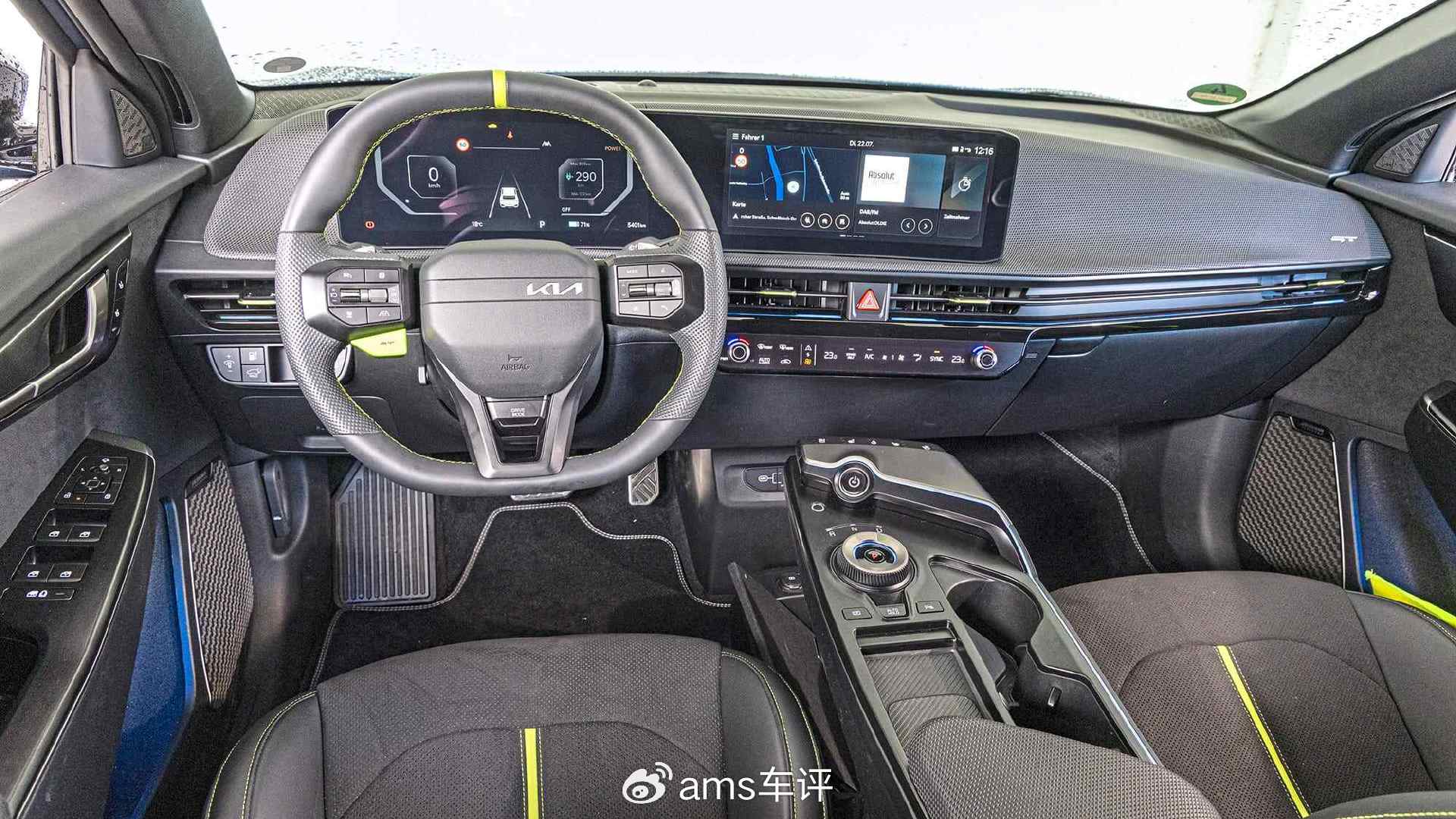 一旦适应了EV6 GT电动车特有的偏高坐姿,驾驶者可以轻松俯瞰极短的发动机舱盖,而悬浮式中控台则让人有种“漂浮感”。一体式运动座椅包裹性极佳,但缺少腰部支撑。操作方面,除中央触控条需兼顾空调与信息娱乐外,其余实体按键丰富,几乎无可挑剔。