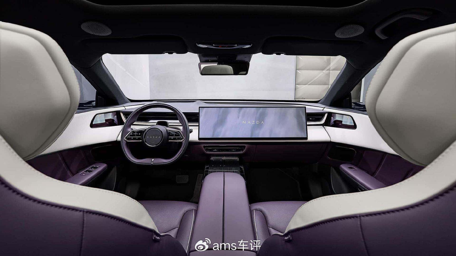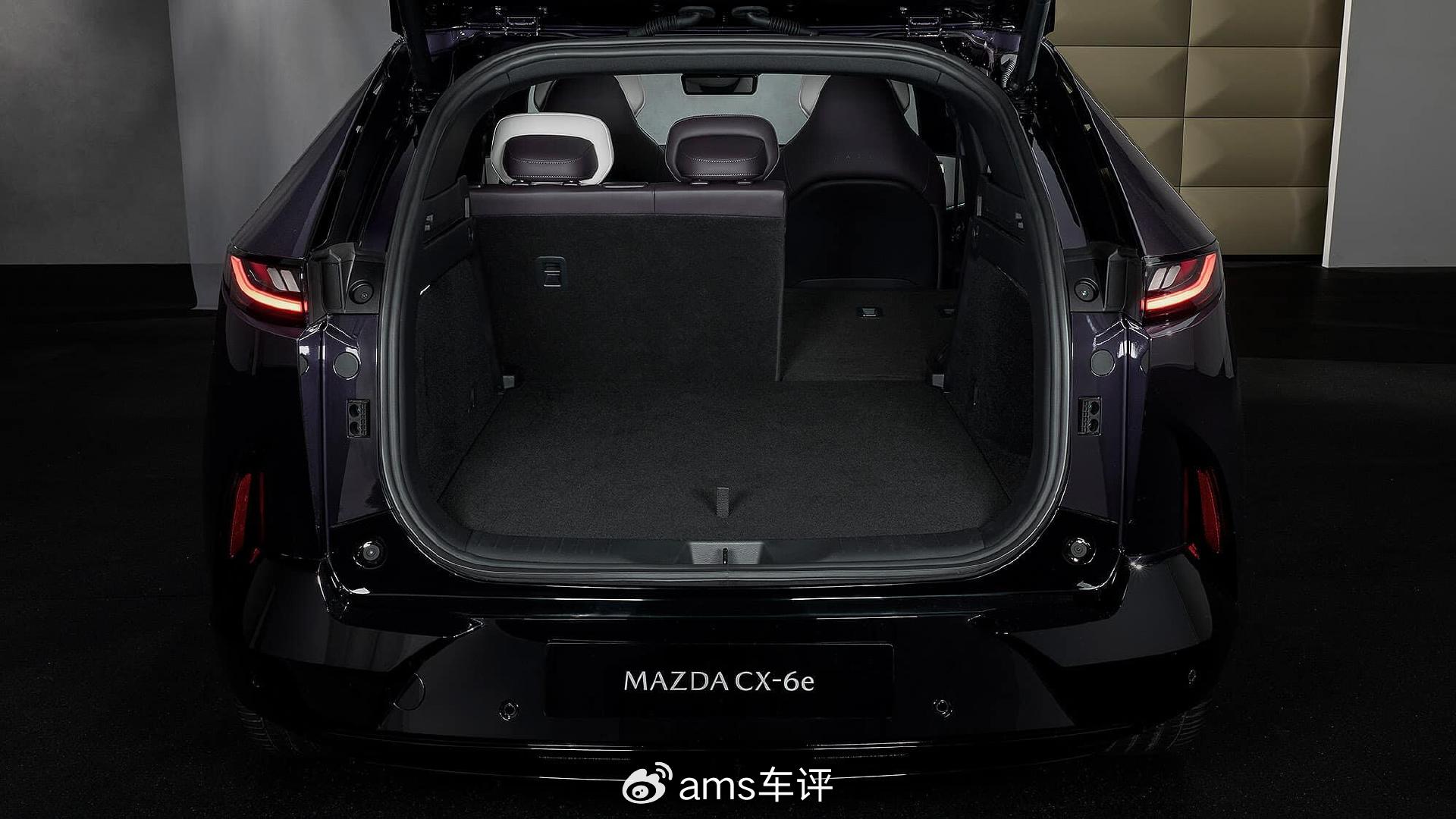 马自达CX-6e内饰的核心设计元素是一条发光的翼状饰条,横贯整个仪表台。新车座椅可选择人造皮革或全新开发的Maztex织物面料,行李空间在468升~1434升之间变化。前机舱下方还有一个额外的储物空间,前备厢容积为83 升,适合存放充电线。