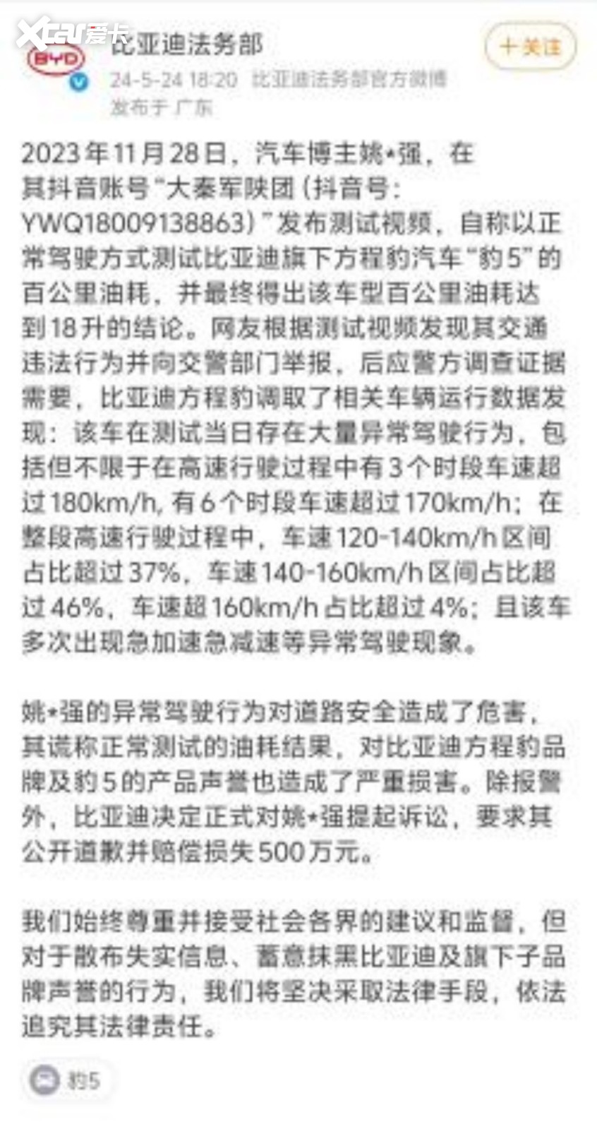 2023 年 12 月,方程豹豹 5 上市之际,姚*强通过抖音账号“大秦军陕团”发布视频,声称以正常驾驶方式测试方程豹旗下车型豹5(配置|询价),得出百公里油耗18升的结论,在网络上引起了大范围的关注及讨论。之后应警方调查取证需要,比亚迪调取数据显示:测试当日车辆存在大量异常驾驶行为,高速行驶过程中有3个时段车速超过180km/h, 有6个时段车速超过170km/h,在整段高速行驶过程中,车速120-140km/h区间占比超过37%,车速140-160km/h区间占比超过46%,车速超160km/h占比超过4%。