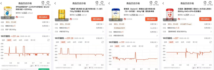记者通过相关价格查询APP,对国内外部分头部品牌奶粉官方门店近180天的网售价格进行对比发现,售价虽有上下波动,但整体并未呈现上涨趋势。