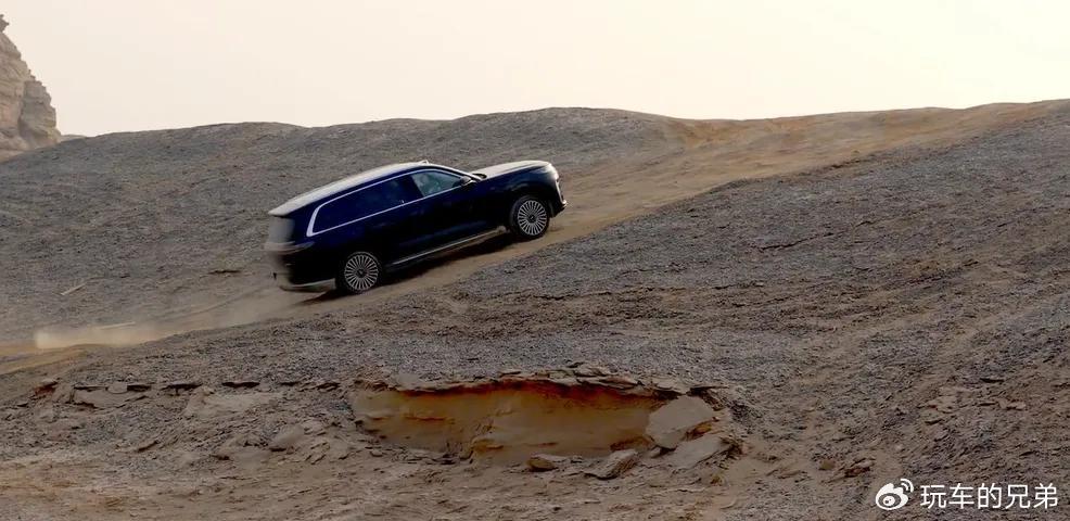 然后是爬坡测试,我特地选了一个坡度很大、表面形状不规则的坡面,坡面上全是松散的砂砾,抓地力大幅下降,这对车辆的动力、四驱系统和路线选择都是很大的考验。我们把风云T11调到脱困模式后,车辆会智能分配前后轮动力,抑制车轮打滑,就算是在最陡的路段,也能稳稳地向上爬,全程没有出现溜坡、打滑的情况,很轻松就爬到了坡顶,从这就能看出这台车的脱困能力,远超同级别很多城市SUV。