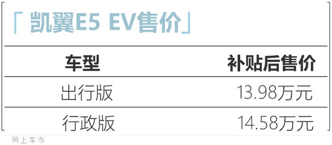 9月1日,凯翼E5 EV正式上市,新车提供出行版、行政版2款配置车型,补贴后售价分别为13.98万元和14.58万元。动力方面,新车采用了三元锂电池搭配永磁同步电机的组合,动力水平超比亚迪秦(配置|询价)EV。值得一提的是,该车还配备有高效智能电驱系统,30分钟可充电至30%-80%。根据该车的市场定位来看,新车将与比亚迪秦 EV、BEIJNG-EU5(配置|询价)等车型展开竞争。