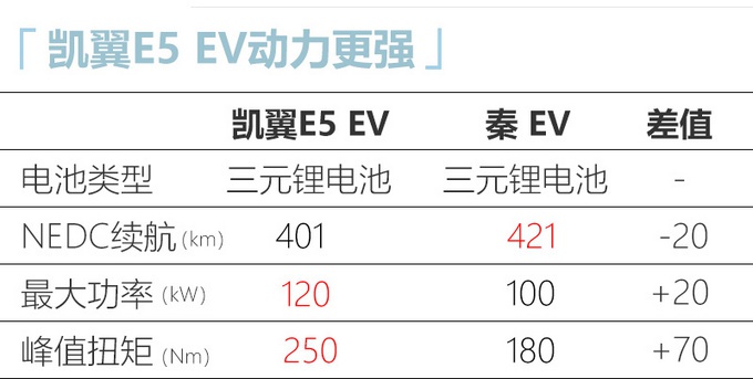 凯翼E5 EV长宽高分别为4572×1825×1496mm,轴距为2670mm,车长不及比亚迪秦 EV,但轴距与比亚迪秦 EV一致。动力方面,凯翼E5 EV将采用三元锂电池与永磁同步电机的组合,最大功率为120kW,最大扭矩250Nm,NEDC续航里程为401km,动力超比亚迪秦 EV。