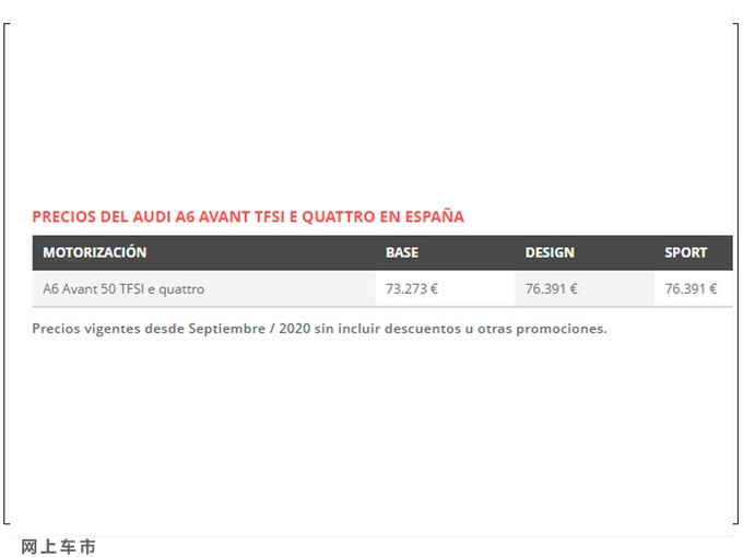 近日海外媒体曝光了一组奥迪新款A6 Avant 50 TFSI e quattro车型西班牙市场售价,新车共计推出三款车型,市场起售价格为73,273欧元(约为59万人民币),并计划将于今年年内上市开售。动力方面,新车将搭载一台2.0T涡轮增压发动机+电动机所组成的插电式混合动力系统,最大输出功率可达223kW,峰值扭矩450N·m,传动系统匹配七速S tronic自动变速箱和quattro四驱系统。外观方面,新车前脸装配了六边形熏黑格栅,车身侧面多辐式铝合金轮毂内部换装了红色卡钳,尾部为隐藏式排气布局。