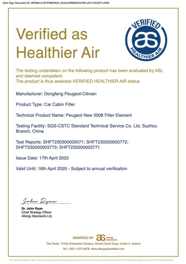 正是因为对座舱空气质量的严苛要求,新5008获得了全球对哮喘和过敏症患者产品的安全性识别的最高权威机构ASL的健康空气认证,有效减少过敏风险,座舱健康度与同获过此认证的奔驰、沃尔沃处于同一水准,可见其座舱品质之高。