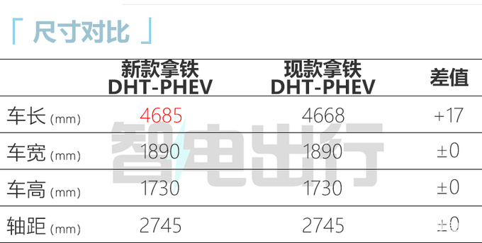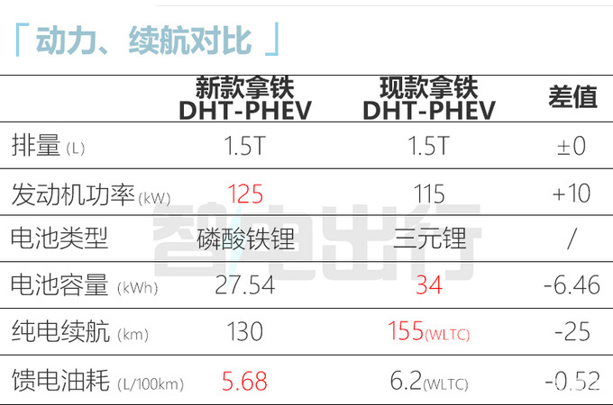 新拿铁DHT-PHEV搭载的1.5T发动机最大功率为125kW,净功率为122kW。新车搭载容量为27.54kWh的磷酸铁锂电池组,纯电续航为130km。