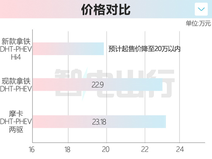 智电出行获悉,魏牌新拿铁DHT-PHEV将在9月上市。新车配备Hi4全新智能四驱电混技术,百公里馈电油耗为5.68L,比现款1.5T四驱超大杯更低。参考新摩卡(配置|询价)DHT-PHEV的定价策略,预计新拿铁DHT-PHEV的起售价将大幅下调,有望降至20万元以内。