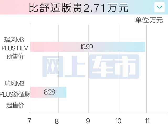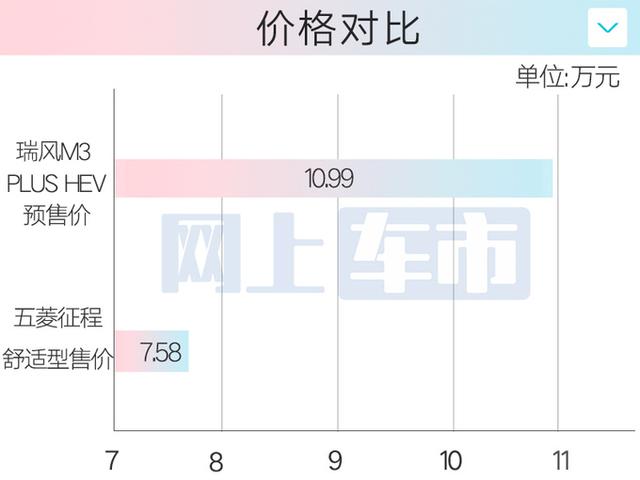 网上车市了解到,江淮瑞风M3(配置|询价) PLUS HEV预售价为10.99万元,比燃油版入门车型贵2.71万元。瑞风M3 PLUS HEV搭载2.0L发动机+P1发电机,通过串联实现增程混动功能,WLTC工况油耗为7.6L/100km,低于同级对手五菱征程(配置|询价)。
