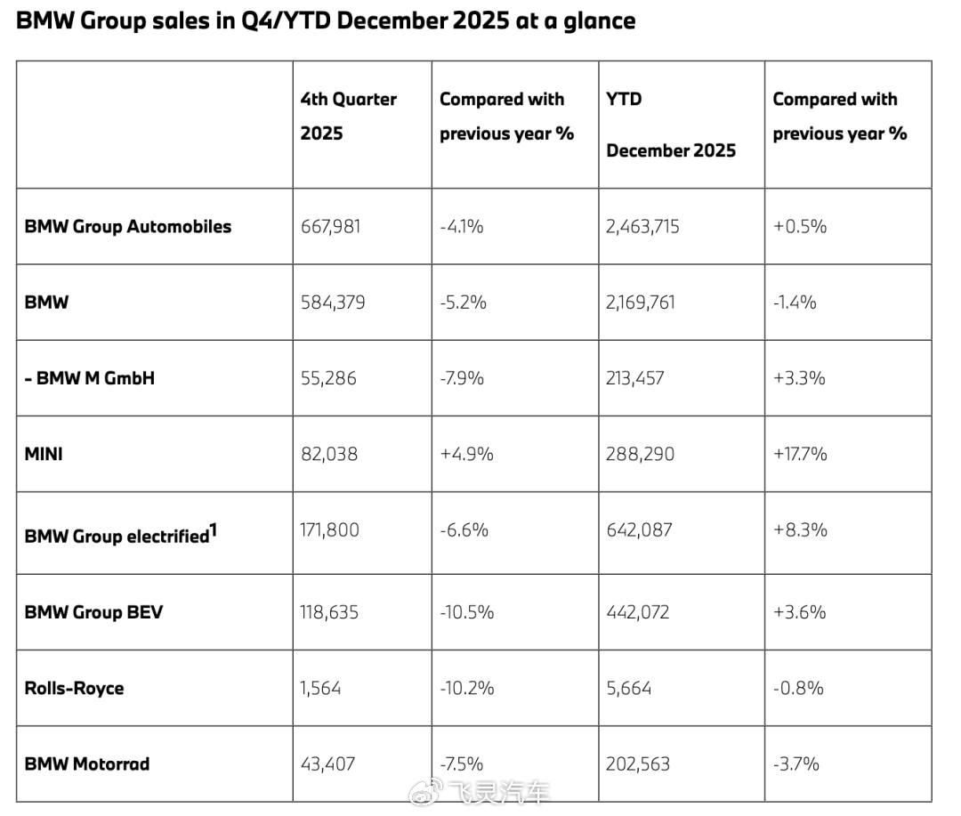1月9日,宝马公布其2025年成绩。2025年,宝马集团(含BMW、MINI和劳斯莱斯)全球总交付量达到246.37万辆,同比微增0.5%,基本守住了基本盘。分品牌来看,2025年BMW品牌全球交付2,169,761辆汽车,同比下降1.4%;MINI品牌全年交付288,290辆汽车,同比增长17.7%;劳斯莱斯品牌交付5,664辆汽车,同比下降0.8%;BMW Motorrad共售出202,563辆摩托车和踏板车,同比下降3.7%。