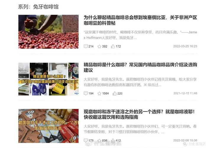 作为十几年的老值友,但真正开始创作还是从入坑咖啡开始,开设了『兔牙咖啡馆』专栏,分享自己购买咖啡设备的经验和使用感受、咖啡设备和咖啡豆选购指南等等,也因为持续高质量的输出咖啡内容,终于得到了值友们和张大妈的认可。