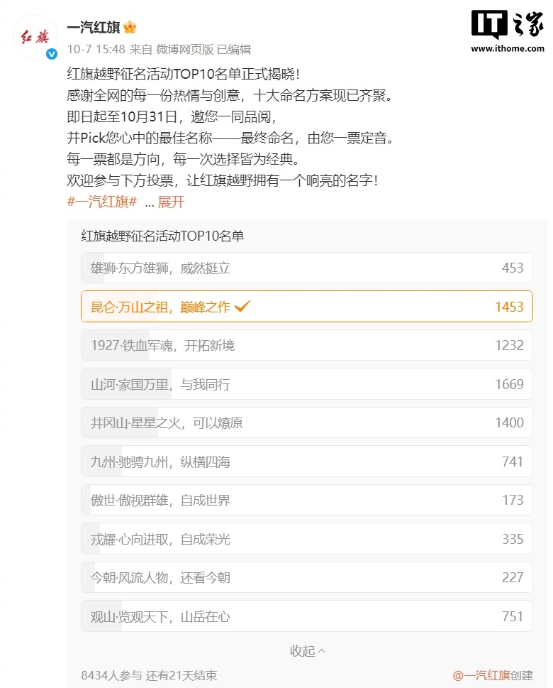 【#红旗豪华硬派越野车征名TOP10# 出炉,采纳者将获赠 001 号车】10 月 10 日消息,红旗品牌首款豪华硬派越野车在 2025 上海车展上迎来全球首发,同步启动“红旗越野车名征集计划”,邀请全球各界共同为“红旗越野”命名,承诺新车上市时,将向最终车名的建议者免费赠送“红旗越野”001 号车。目前征名活动 TOP10 名单已经出炉,分别为雄狮、昆仑、1927、山河、井冈山、九州、傲世、戎耀、今朝、观山。从一汽红旗官方发起的投票来看,截至IT之家发文,“山河”的得票率最高,“昆仑”“井冈山”紧随其后。