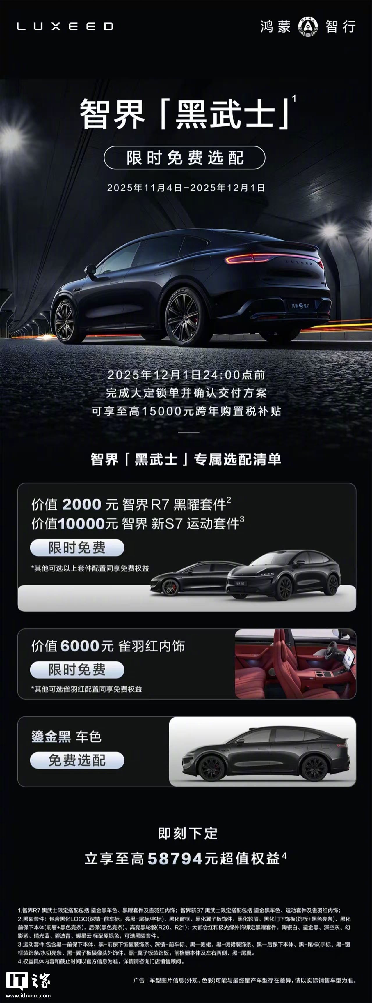 【鸿蒙智行智界(配置|询价)「黑武士」限时免费选配,含 R7 / 新 S7 车型黑曜 / 运动套件】鸿蒙智行官方今日宣布了“智界两周年,惊喜 double”相关活动:即日起至 12 月 1 日,智界「黑武士」限时免费选配,包括智界 R7 的黑曜套件和智界新 S7(配置|询价) 的运动套件,以及雀羽红内饰均限时免费。
