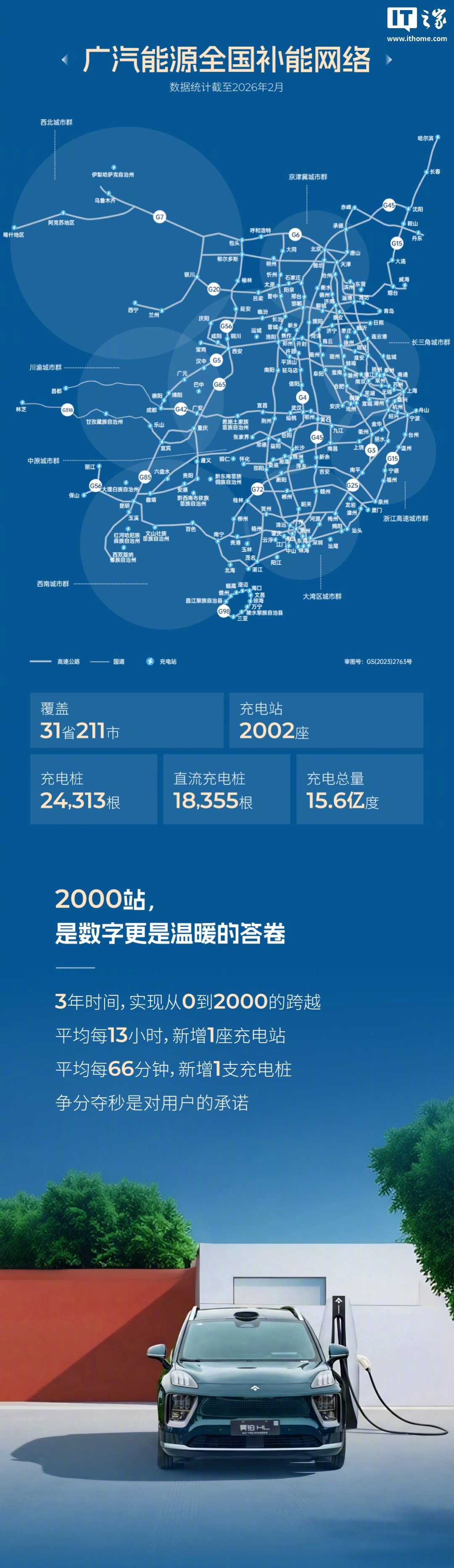 【广汽自营充电站达成 2000 站里程碑,全国补能网络覆盖 31 省 211 市】广汽集团今日宣布,广汽自营充电站正式达成 2000 站里程碑(充电站 2002 座)。广汽能源全国补能网络(数据统计截至 2026 年 2 月)覆盖 31 省 211 市,充电桩 24313 根、直流充电桩 18355 根、充电总量 15.6 亿度。
