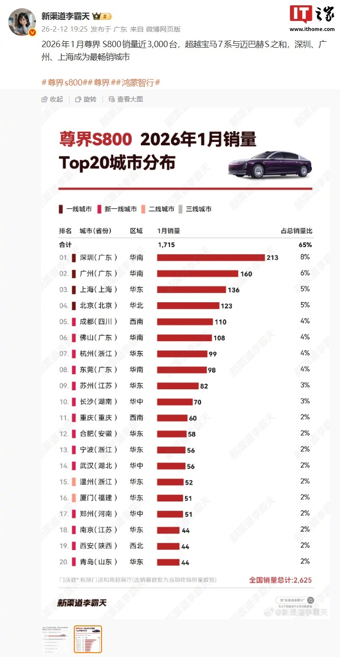 【鸿蒙智行尊界 S800 轿车 1 月销量曝近 3000 台,消息称已超越宝马 7 系与迈巴赫 S 之和】据博主 @新渠道李霸天 透露:2026 年 1 月尊界 S800 销量近 3000 台(2625 台),超越宝马 7 系与迈巴赫 S 级之和,深圳、广州、上海成为最畅销城市。#鸿蒙智行# #尊界S800(配置|询价)#