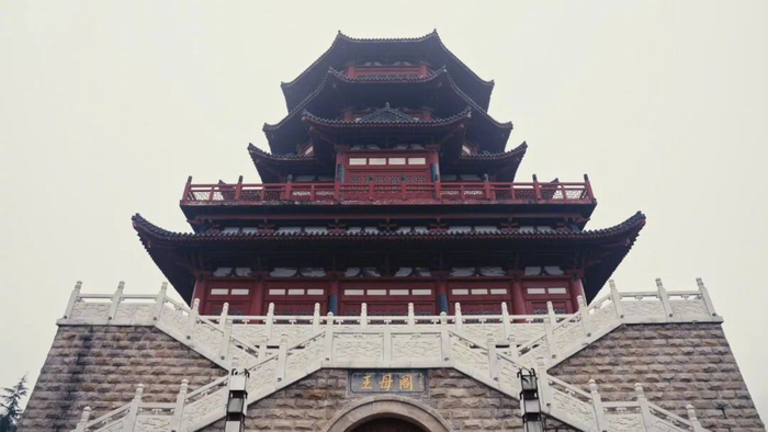 远处的王母阁倒映在澄澈的湖水中,红墙黛瓦与蓝灰色的天空相映成趣,古色古香的韵味扑面而来,仿佛穿越回了千年之前。