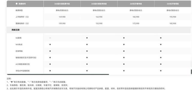 先得明确一点:风云 A9L 的官方配色,目前所有权威渠道的信息是高度统一的。我翻了奇瑞官网的配置表,在最下方 “注明” 部分清晰写着 6 种车身颜色:墨石黑、极光绿、云烟紫、车厘子红、星瀚银、玄武灰;为啥少了蓝色?其实看车型定位就懂了。风云A9L主打的是“家用+商务”双重场景,蓝色在汽车里要么偏“运动”(比如性能车的亮蓝),要么偏“清新”(比如小型车的浅蓝),刚好卡在这两个场景中间,不够“精准”。比如商务用户不会选太跳的蓝,家庭用户又觉得蓝色不如黑、银耐脏,与其加一个“小众且不实用”的颜色,不如把现有6种颜色的质感做扎实,这倒是符合奇瑞“务实”的调性。