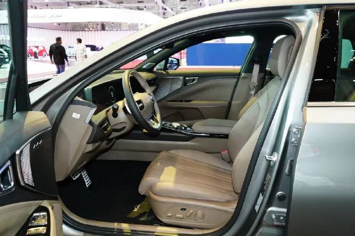 内饰部分,新车整体表现中规中矩,车内采用棕色菱形图案皮革包覆、木纹饰板等,看起来十分豪华。车内配备双12英寸联屏,空调控制部分采用触控设计,搭载HVAC智能系统控件和信息娱乐系统操控快捷键,并配备了Meridian的14个立体声音响。