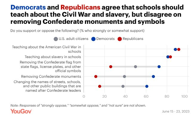 YouGov在2023年7月发布的调查报告显示,民主党人中支持移除南方邦联纪念碑的比例至少是共和党人的四倍。有61%的民主党人支持拆除,而只有15%共和党人持相同看法。同时,67%的民主党人倾向于改变以南方邦联领导人命名的街道、学校和其他公共建筑的名称,而在共和党人中仅有12%。在支持从州旗、车牌和其他官方符号中移除南方邦联旗帜的问题上,民主党和共和党的支持度对比是72%比26%。此外,黑人比白人更倾向于支持上述三项变化。