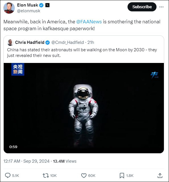 9月29日,马斯克还借中国发布登月服一事,吐槽FAA“正在扼杀”美国的太空计划。