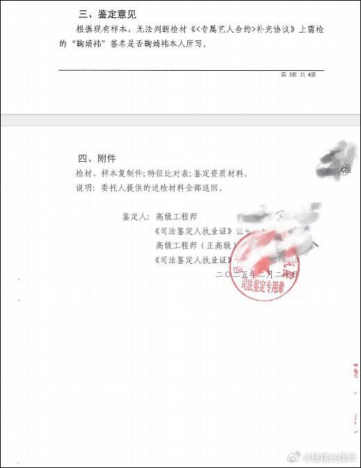 12月16日,上海丝芭文化传媒集团@丝芭传媒 称已经委托具备司法鉴定专业资质的鉴定机构就笔迹进行鉴定,称2018年的《补充协议》是鞠婧祎所签,鞠婧祎应当继续履约。