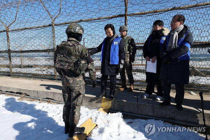 1月21日,韩国统一部长官郑东泳(左二)前往位于江原道高城郡的韩朝非军事区徒步通道“和平之路”进行视察。 韩联社