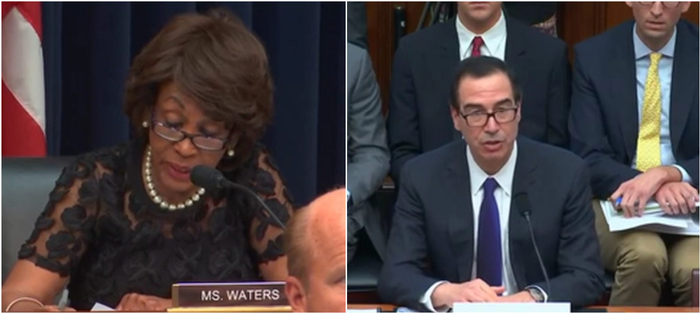 2017年,还是在众议院金融服务委员会的听证会上,沃特斯提问关于特朗普与俄罗斯银行关系的问题时,刚上任半年的姆努钦在回答前说了一堆客套恭维沃特斯的废话。