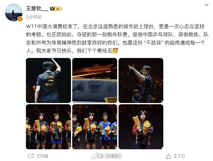 【#王楚钦中国大满贯后发文#】10月6日,@王楚钦___ 发文 :WTT中国大满贯结束了,在北京这座熟悉的城市站上球台,更是一次心态与坚持的考验。也正因如此,夺冠的那一刻格外珍贵。感谢中国乒乓球队,感谢教练、队友和所有为体育精神热烈鼓掌欢呼的你们。也愿这份 “不放弃” 的能传递给每一个人。祝大家节日快乐,我们下个赛场见![]()