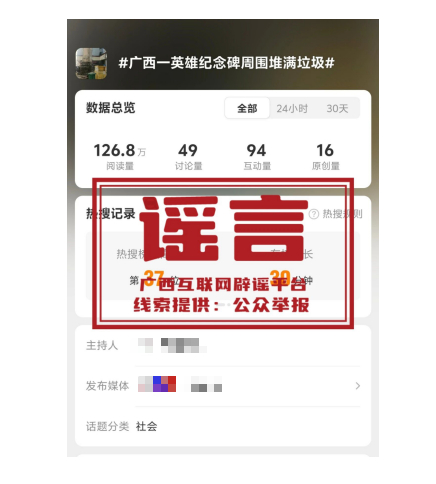 近日,网络上出现“广西一英雄纪念碑周围堆满垃圾”的信息,并有媒体开设话题,引发关注和炒作。