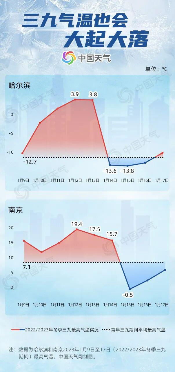 然而,三九偏暖并不是天天都暖,也可能出现阶段性降温,甚至出现气温过山车的现象。以2023年1月9日至17日这个三九为例,哈尔滨、南京就出现了气温震荡的情况,哈尔滨两天之内从3.8℃骤降到零下13.6℃,气温大跳水,直接跳进“冰窟窿”;南京则从前一天的15.7℃降到零下0.5℃,实现“俯冲式”降温,两天跨两季。