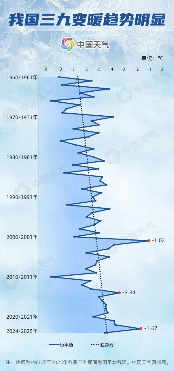 三九偏暖并不少见,且呈现逐渐变暖的趋势。过去六十多年间,三九期间全国平均气温呈现波动上升趋势,1961至1970年三九平均气温为零下6.37℃,2011年至2020年为零下4.89℃,前后对比,上升了大约1.5℃。而且,三九期间最暖的三年都出现在21世纪以后。