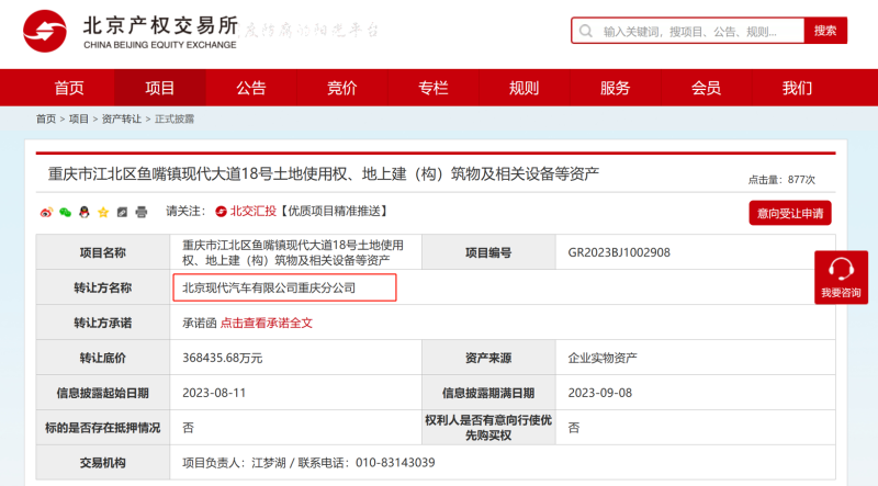 易车讯据北京产权交易所网站发布的文件显示,韩国汽车制造商现代汽车在中国的合资公司拟以36.8亿元人民币的价格转让位于重庆的工厂。出售的资产包括土地使用权、地上建(构)筑物及相关设备等资产。