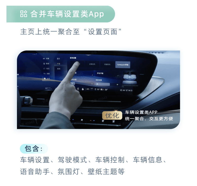 在交互体验方面,此次升级后,合并车辆设置类App,主页上统一聚合至“设置页面”。包括车辆设置、驾驶模式、车辆控制、车辆信息、语音助手、氛围灯和壁纸主题等操作均统一在该页面进行。而仪表视图、驾驶辅助视图和导航视图也得到了整合,车机卡片支持手动调整变更,并新增了可替换项。此外,在其他方面,OTA还对Apple CarPlay显示区域优化、个性化主页卡片点击后支持满尺寸显示、雷达算法,改善智能驾驶辅助的体验、蓝牙连接的稳定性、车辆模型显示特效进行了优化。