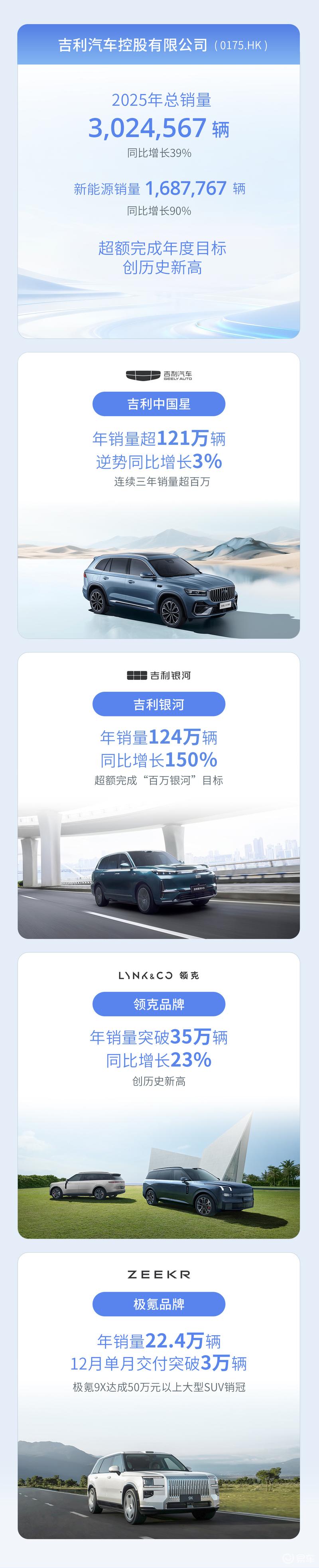 易车讯 今日,吉利控股集团发布2025全年销量:年销量412万辆,连续5年增长,首破400万大关。新能源年销量229万辆,同比增长58%,新能源渗透率达56%