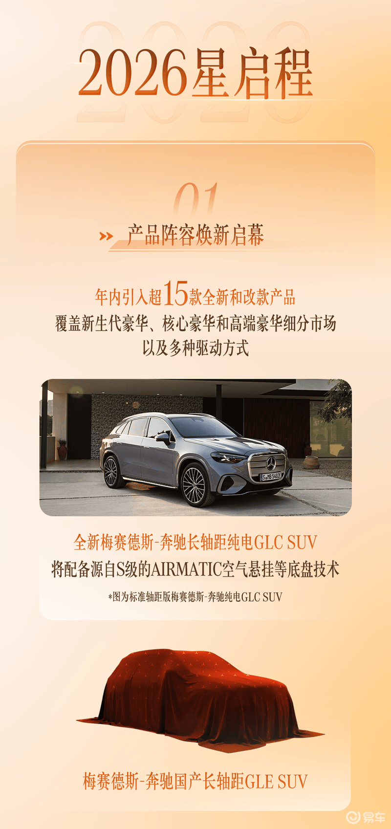 2026年,梅赛德斯-奔驰将在国内引入超15款全新和改款产品,其中全新长轴距纯电GLC SUV将配备AIRMATIC空气悬挂等底盘技术;国产长轴距GLE SUV、新一代S级也将正式发布。