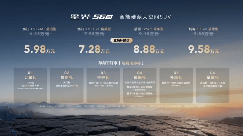 易车讯 1月15日,五菱官方宣布五菱星光560(配置|询价)迎来正式上市,新车共推出4款车型,售价区间6.28-9.88万元,置换补贴价5.98-9.58万元。同时,即刻下订,可享受“马到成功礼”。新车提供燃油、插混、纯电三种动力形式以供消费者选择。