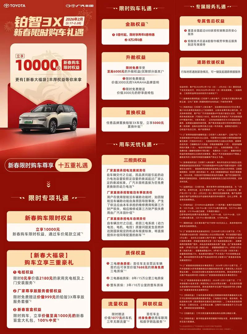 易车讯 日前,广汽丰田宣布旗下铂智3X(配置|询价)推出新春限时购车礼遇,2月17日-28日购车可享1万元限时权益(通过尾款立减)。除此之外官方还推出新春大福袋,包含充电桩权益、厂家尊享版服务套餐权益和新春盲盒权益等。