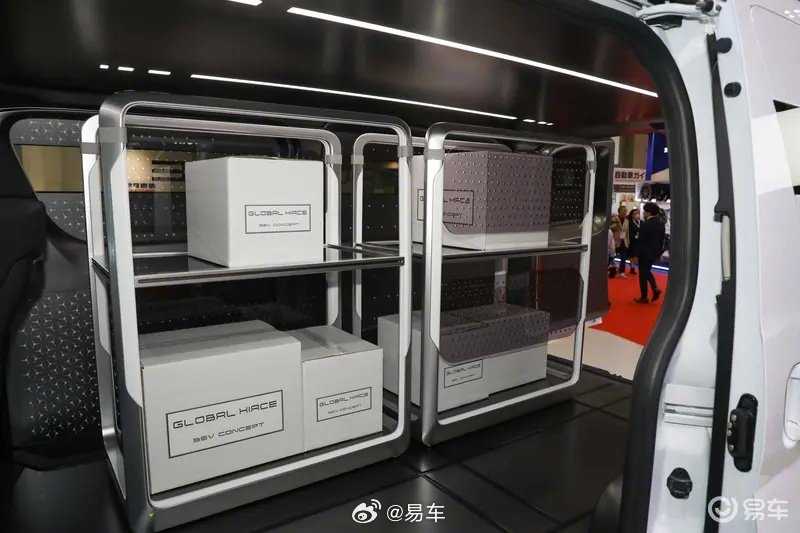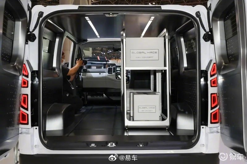 内饰在原有量产车的基础上,换装液晶仪表和旋钮换挡机构,中控台也被一整块大尺寸触屏所覆盖,仅保留一枚旋钮用来控制空调温度。除了主驾之外的座椅均被拆卸,从而提供最大化的纯平装载空间。