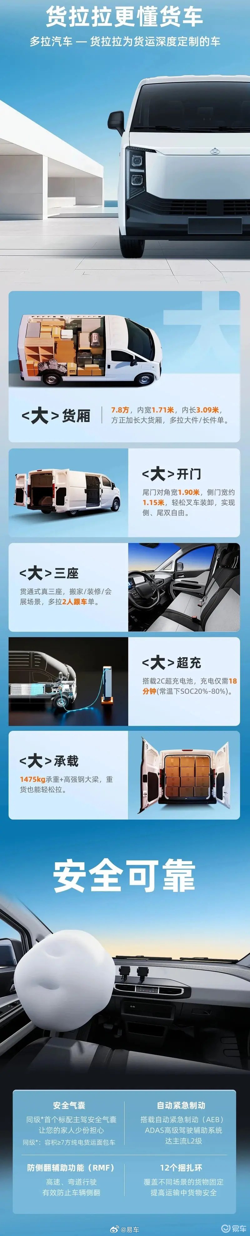 #新车速递#【货拉拉旗下首款货车“多拉大面”上市 售价7.68万元起】7月26日,货拉拉旗下汽车科技品牌“货拉拉多拉”宣布,首款专属货车“多拉大面”正式上市,官方起售价为7.68 万元,推出经济版、实用版、飞跃版、全能版、梦想版5个配置等级。多拉汽车产品经理表示,新车是以大货厢、大三座、大开门、大超充、大承载为“五大”核心功能特点进行了产品升级。
