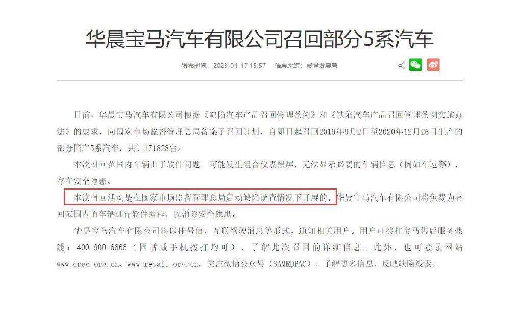 从公开的信息来看,此次宝马5系(配置|询价)召回主要原因则是软件问题,可能发生组合仪表黑屏,无法显示必要的车辆信息(例如车速等),存在安全隐患。而针对此问题,华晨宝马也将对召回车辆进行软件编程,以消除安全隐患。