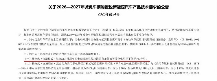 其中明确表示,插电式含增程式混合动力乘用车,纯电续航里程应不低于100公里!