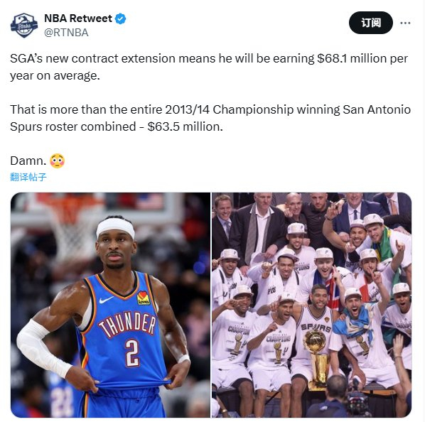 直播吧08月07日讯 近日,美媒NBA Retweet对比了雷霆球星亚历山大新合同平均年薪和14冠军马刺全队队员总薪资。