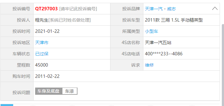 相信大家看到这里都已经对于天津天一汽这一个企业有了一个简单的了解,那么我们便事不宜迟,这就开始我们今天的案例报道。事情发生在我国的天津市,程先生在2011年的2月22日于天津一汽五站中购买了一台威志,但是就在前两个月,车辆出现了一些严重的状况,车辆开始出现严重的锈蚀,据程先生向我们透漏,车辆在2019年的时候曾发现下裙部分出现了一小部分锈蚀,当时这点小锈蚀并没有引起程先生的重视,直到21年的1月,程先生车辆在日常保养的时候才发现了大面积的锈蚀,这让程先生感到诧异,天津的气候并不会潮湿,加上下裙存过来没有出现过碰撞,怎么会出现如此大面积的锈蚀呢?程先生自己去检查的时候发现,车辆的钢板已经被完全的锈穿了,程先生稍微的敲击钢板,铁锈的哗哗啦啦的往下落,不仅如此,在后来的检查中程先生还发现,车辆的副车架也出现了由内到外的锈蚀,这让程先生感到不安,要求天津一汽厂家给予免费维修,并且把这件事发在了我们投诉网上,希望可以得到解决,目前厂家并没有针对这件事做出任何的表态,我们投诉网正在积极的跟进中。